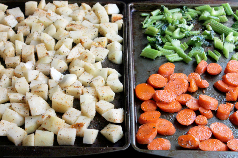 Rinse vegetables, pat dry, cut into 1/2 inch chunks and place on a baking sheet. Top vegetables with about 1 teaspoon of olive oil and seasoning blend, mix well.
