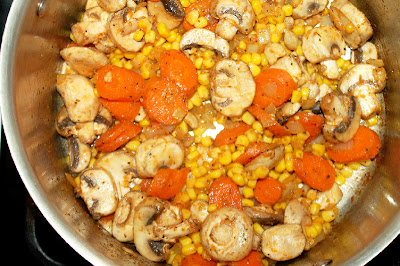 Add corn, mushrooms and onion, season with 2 teaspoons of seasoning blend and cook uncovered for about 8 minutes, stirring occasionally.