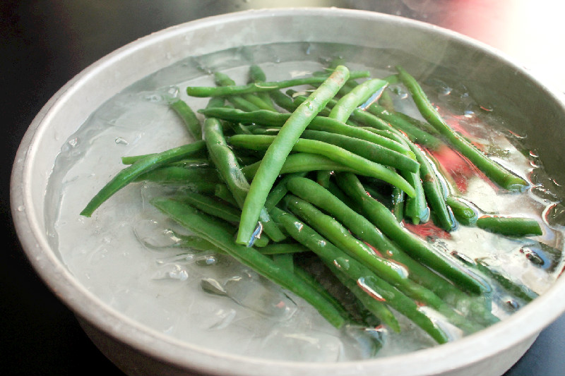 Drop green beans into water and boil for 4 minutes, remove and immediately shock in ice water to stop the cooking process and retain bright green color.