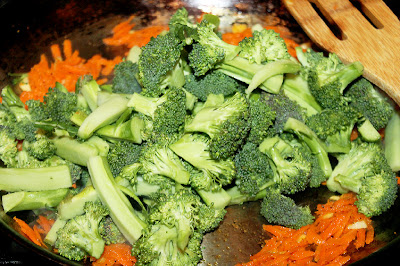Rinse broccoli, cut into florets, bite sized, slice up some of the stem, and set aside