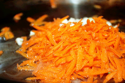 In a medium pan add about 1 tablespoon olive oil over medium high heat, add carrots and garlic, saute 1 minute.