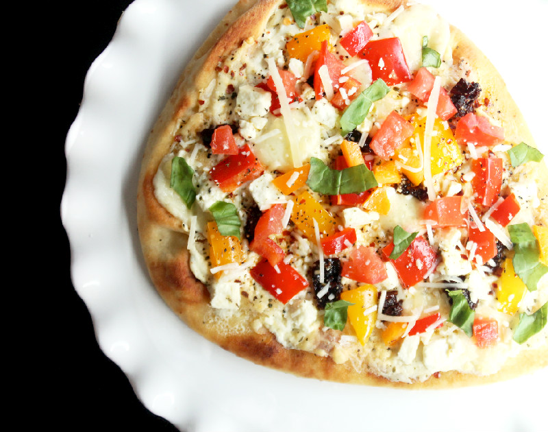 I simply spread Rondelle Cheese on the bottom of the crust, top with bell peppers, sun dried tomatoes and a pinch of spices.