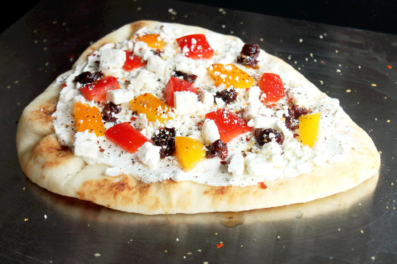Spread Rondele cheese on both Naan breads, leave about a 1 inch border. Top with peppers, sun dried tomatoes and feta cheese.