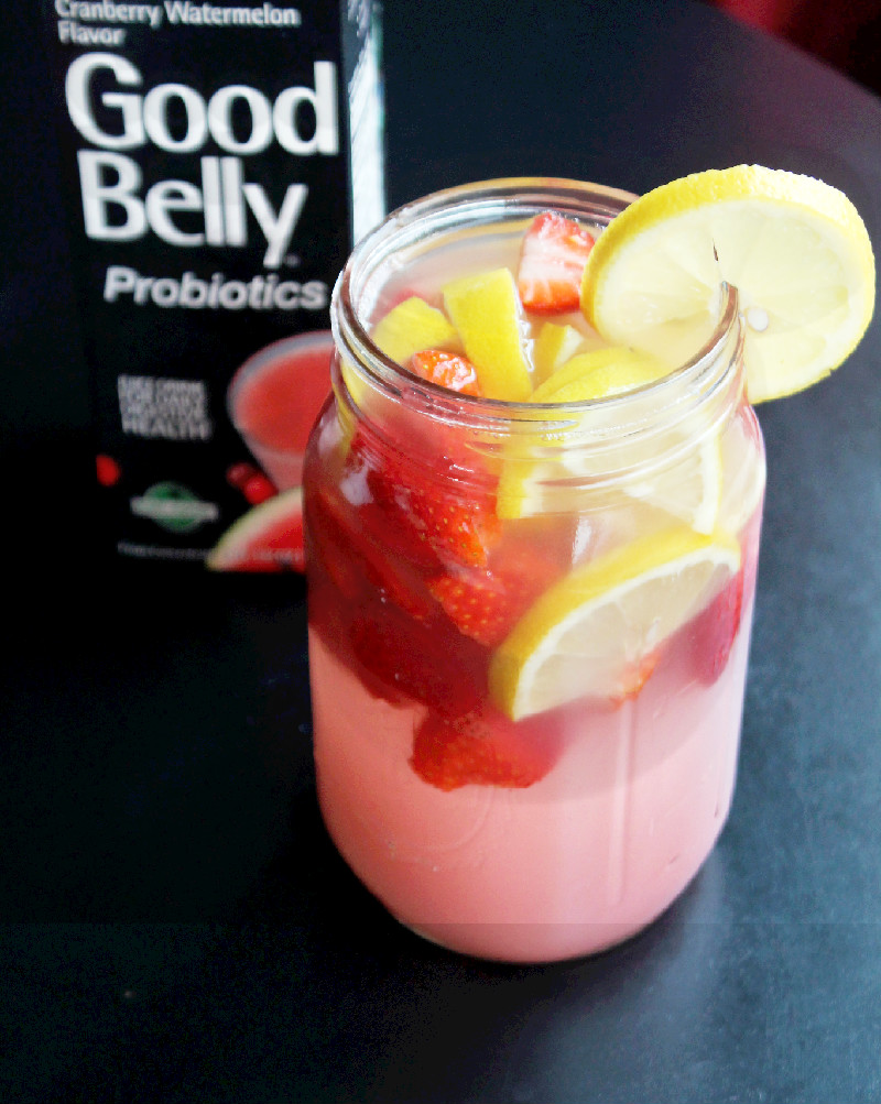 It’s really simple, take some liquid probiotics, add purified water, fresh strawberry’s, sliced lemons, and a little Aloe Vera Juice.