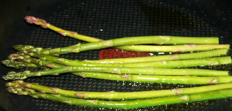 Remove the tough ends off the asparagus and saute for about 5 minutes in a little olive oil.