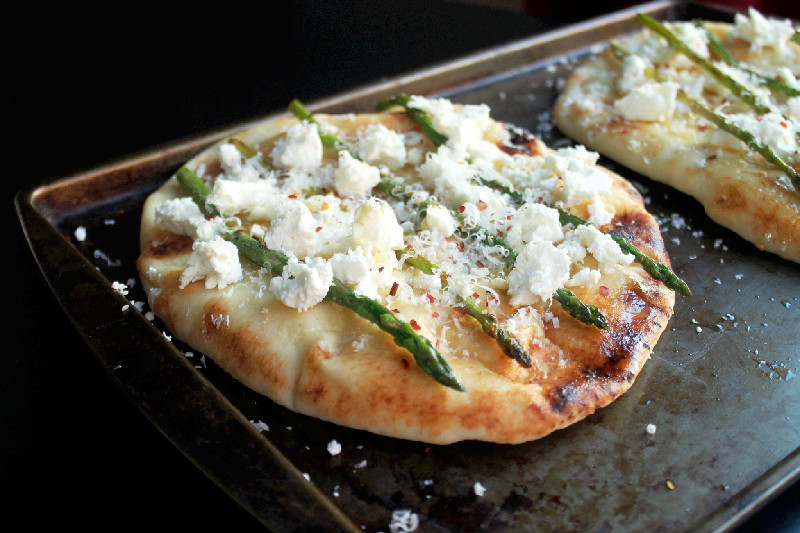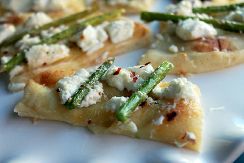 Goat Cheese Flatbread Pizzas with Sauteed Asparagus Spears