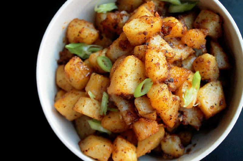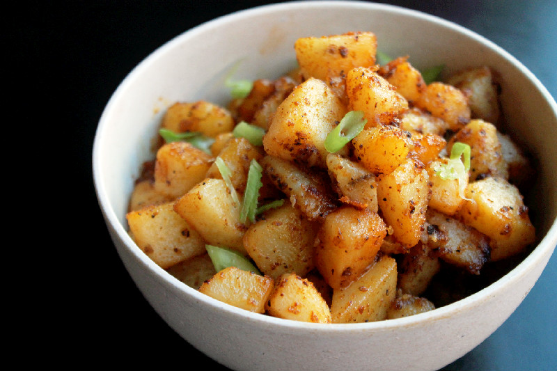 Now Indian potatoes normally are sauteed potatoes that are spicy and flavorful, often it appears that curry powder is added.