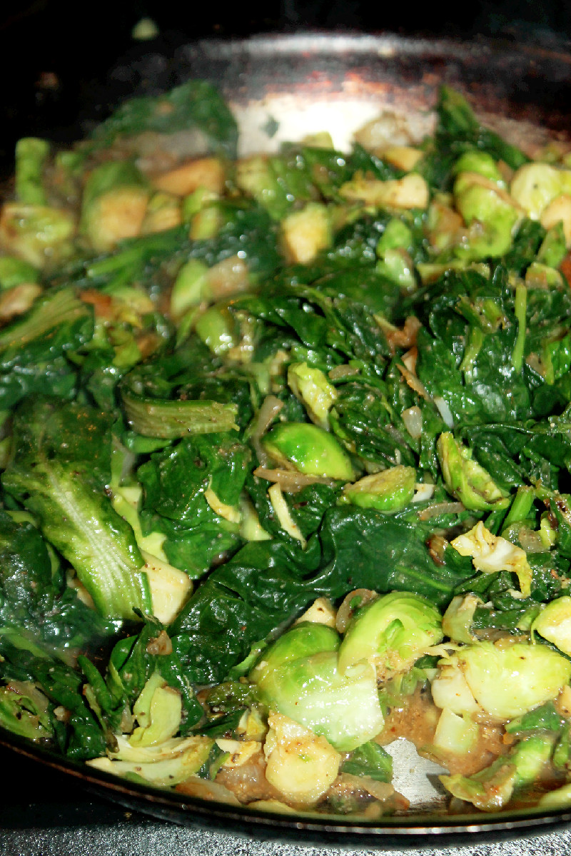 Add spinach and brussels sprouts to pan, season with 2 tablespoons of seasoning blend and mix well. Cook about 5 minutes until brussels spouts are fork tender.