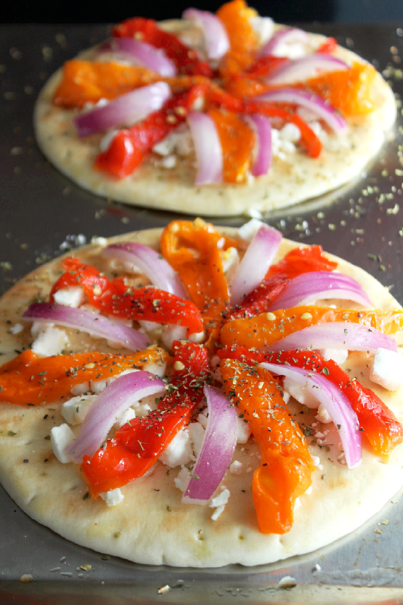 To assemble pizza, drizzle pitas with olive oil, top with feta cheese, top with peppers and onions.