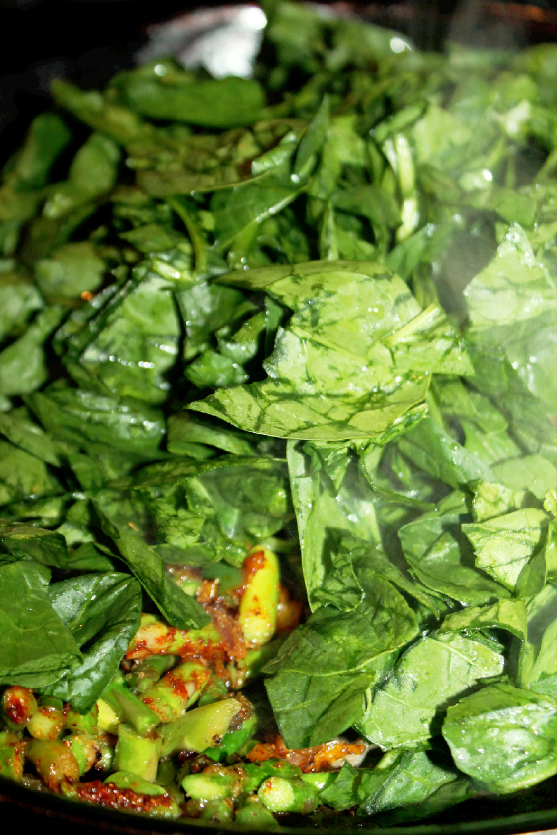 Add asparagus and spinach, season with 1 teaspoon of seasoning blend and cook until tender about 10 minutes taste for flavor, add more seasonings if needed, allow to cool slightly.