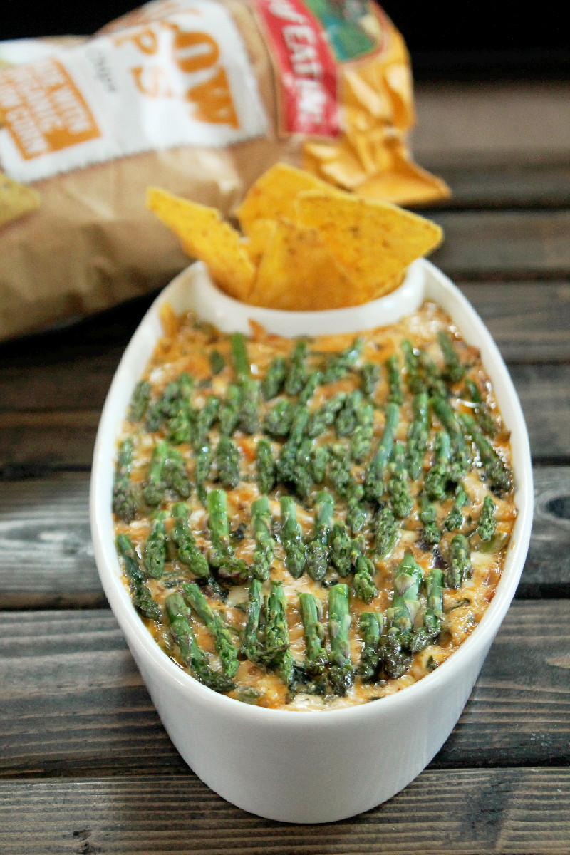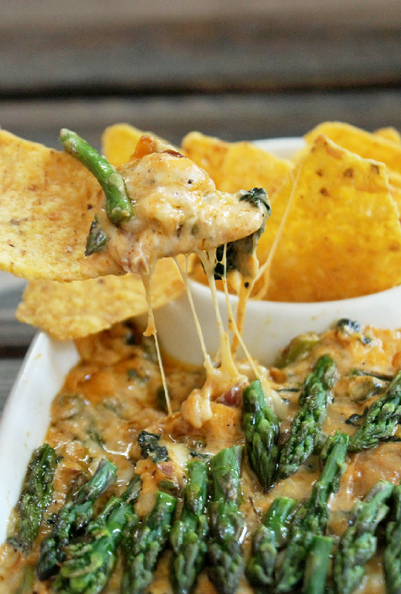 Remove about 1 inch of hard steam from bottom of asparagus spears, discard. Cut tips off asparagus and set aside to garnish the top of dip.
