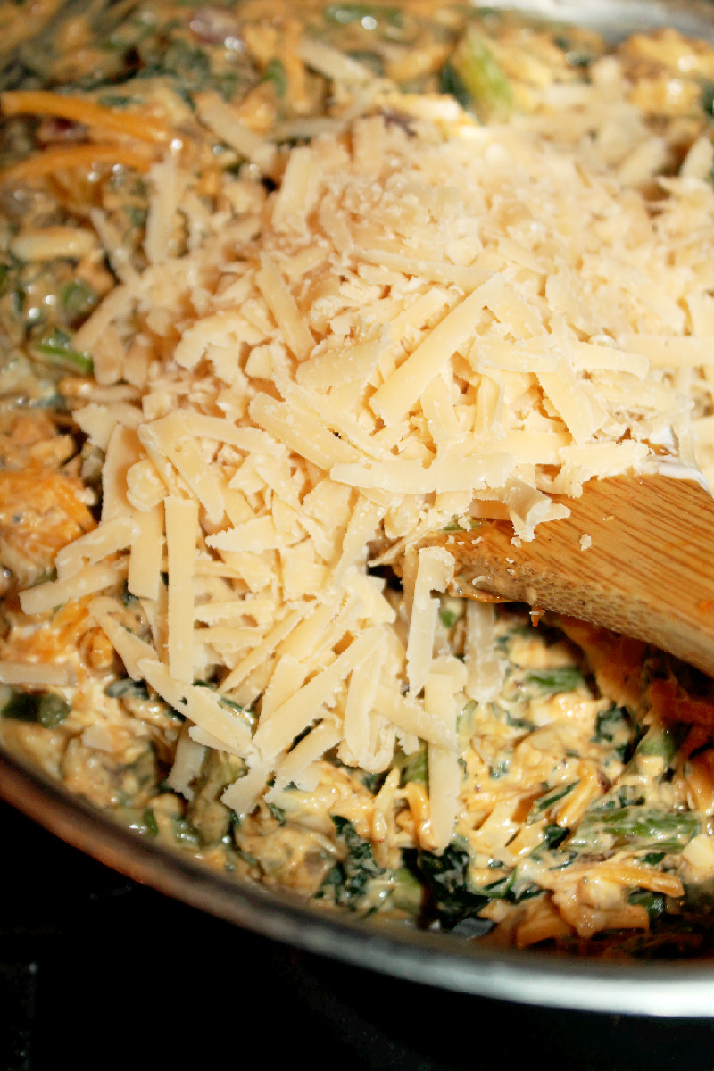 Allow the veggie mixture to cool slightly and fold in the all the cheeses, mayo, and creams.